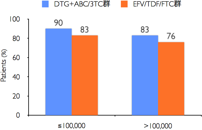 ベースラインのRNA量(10万コピー/mL)で分けたHIV-RNA量 50コピー/mL未満の達成率