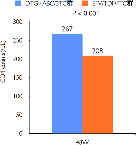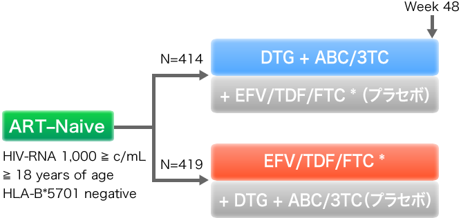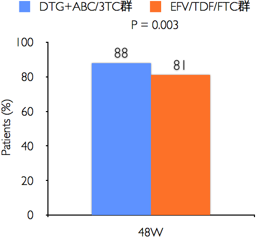 ・ 48週までの解析においてDTG+ABC/3TC群は、EFV/TDF/FTC群に対して安全性に優れ、より効果的なウイルス抑制結果を示した。