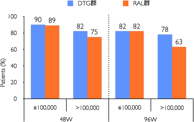 ベースラインのRNA量(10万コピー/mL)で分けたHIV-RNA量 50コピー/mL未満の達成率