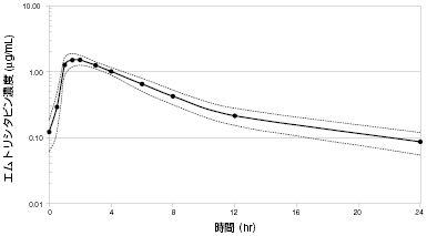 HIV感染患者20例に本剤200mgを1日1回反復投与した後の,定常状態のエムトリシタビンの平均血漿中濃度推移を図1に示す。